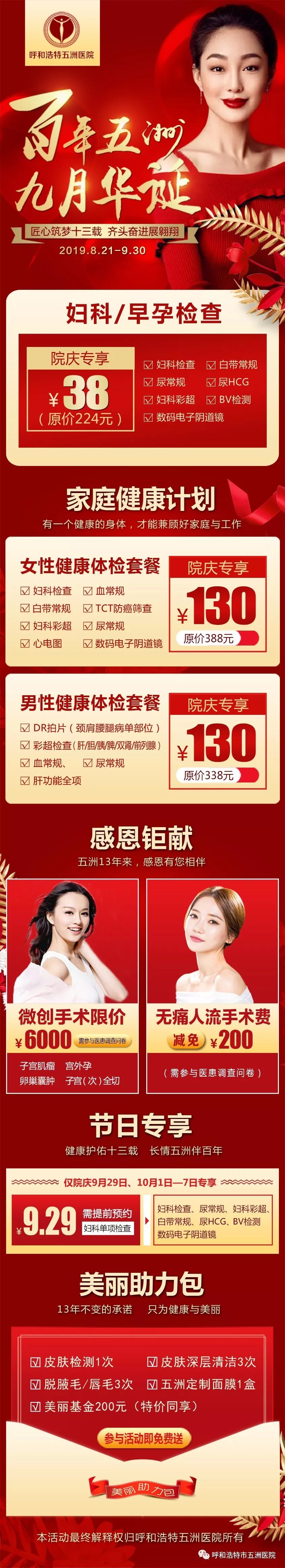 以上就是呼和浩特五洲医院妇科专家对于"【五洲13周年庆】百年五洲,九月华诞|五重健康"的详细介绍,希望对大家有帮助。如想了解更多,欢迎点击在线咨询或者拨打健康热线:0471-3339344,权威专家会一一为您解答。